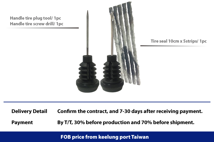 Mini handle tire plug tool/ 1pc Mini handle rasp drill/ 1pc Tire seal 10cm x 5strips (Dia. 3.5mm)/ 1pc