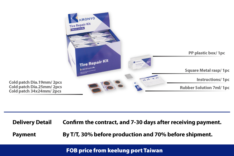 Rubber solution 7ml/ 1pc Metal rasp/ 1pc Cold patch Dia. 19mm/ 2pcs Cold patch Dia. 25mm/ 2pcs Cold patch 34 x 24mm/ 2pcs PP plastic box/ 1pc