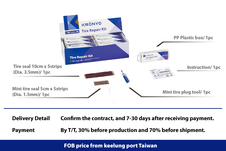 Mini tire plug tool/ 1pc Tire seal 10cm x 5strips (Dia. 3.5mm)/ 1pc Mini Tire seal 5cm x 5strips (Dia. 1.5mm)/ 1pc Instructions/ 1pc
