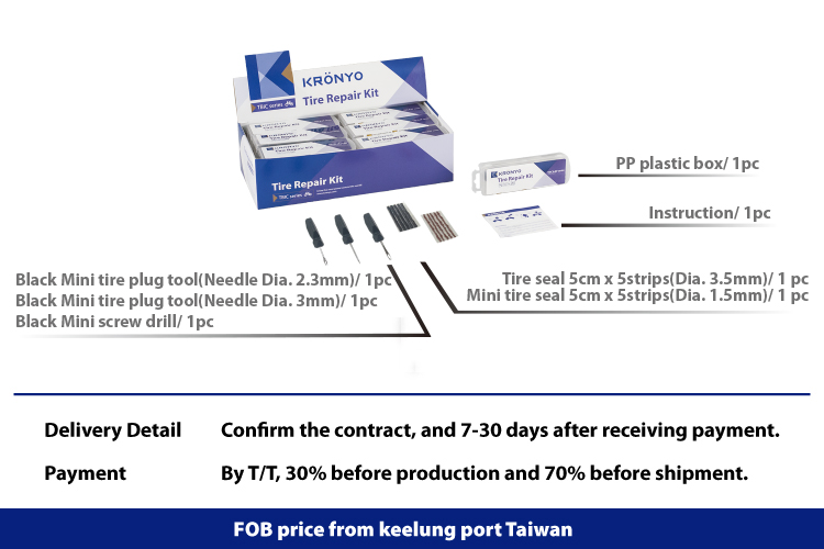 Black Mini screw drill/ 1pc Mini tire plug tool(Needle Dia. 2.3mm)/ 1pc Mini tire plug tool(Needle Dia. 3mm)/ 1pc Tire seal 5cm x 5strips(Dia. 3.5mm)/ 1pc Mini Tire seal 5cm x 5strips(Dia. 1.5mm)/ 1pc