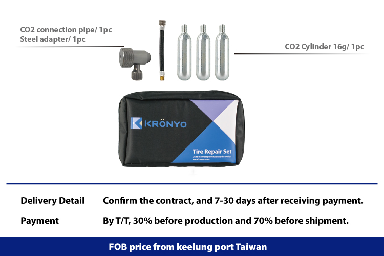 Nylon Co2 repair kit bag/ 1pc Co2 cylinder 16g/ 3pcs Co2 connection pipe/ 1pc Steel adapter/ 1pc