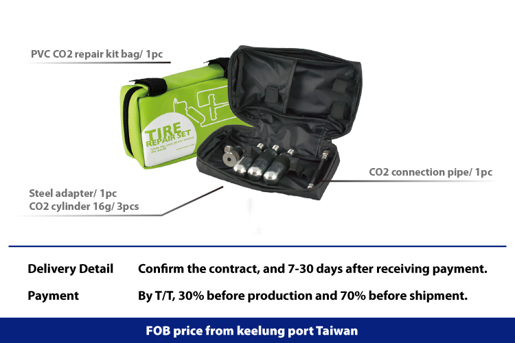 Rubber Co2 repair kit bag/ 1pc Co2 cylinder 16g/ 3pcs Co2 connection pipe/ 1pc Steel adapter/ 1pc